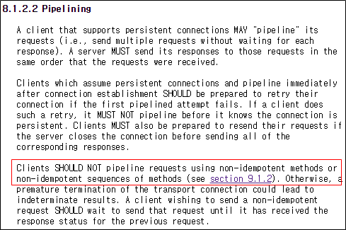 주의해야 할 부분은 'non-idempotent methods' 가 파이프라인으로 전달되는 요청에 없어야 한다는 것.
