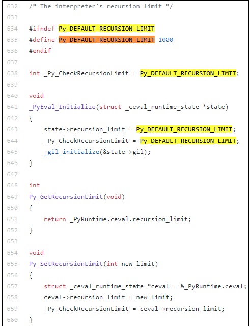 공식 문서 상(?)에 default recursion limit이 보이지 않아 파이썬 소스를 살펴봄.