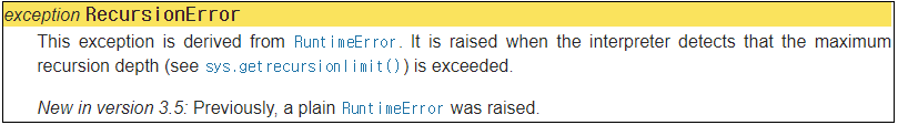 https://docs.python.org/3/library/exceptions.html#RecursionError