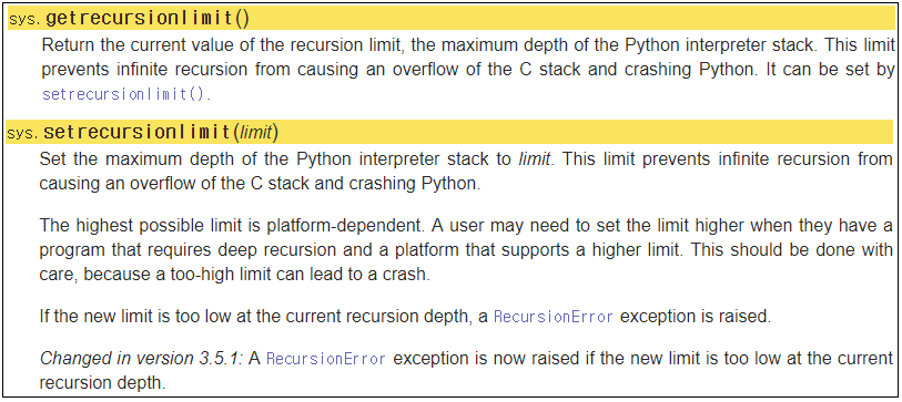 - setrecursionlimit(limit)으로 기본 임계값 수치 조정이 가능함